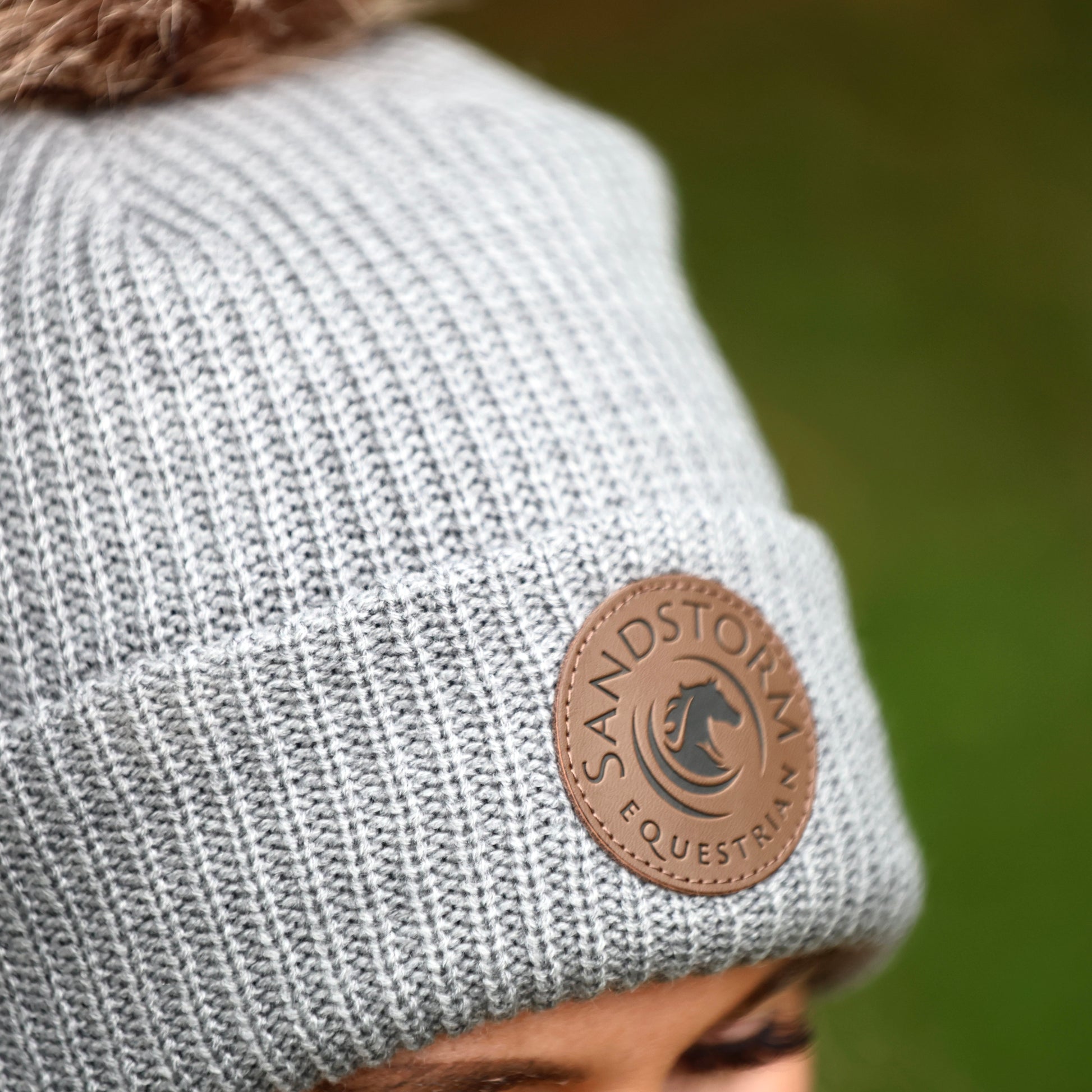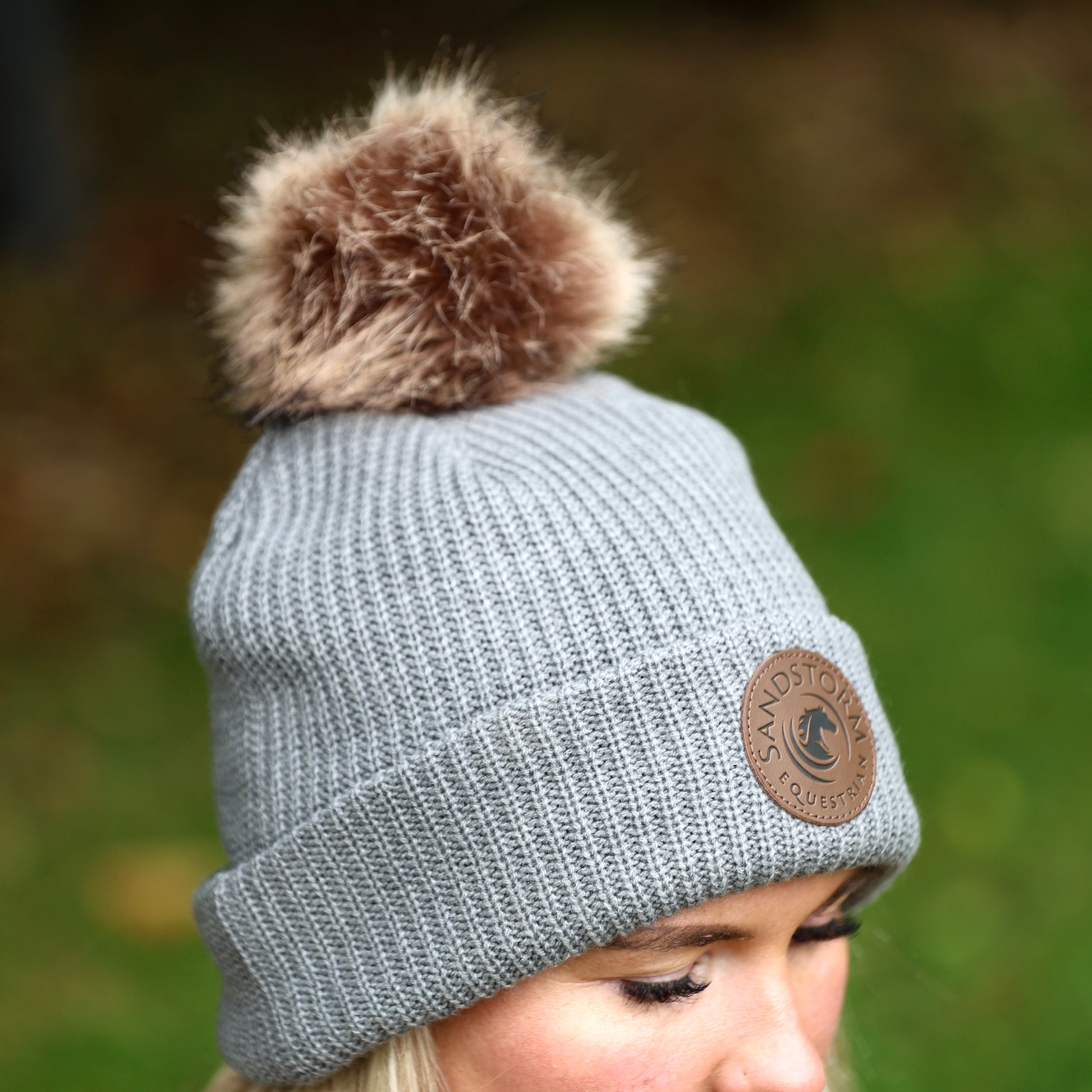 Each beanie features a luxurious faux fur pom-pom and the signature Sandstorm Equestrian leather patch for a touch of classic equestrian style.